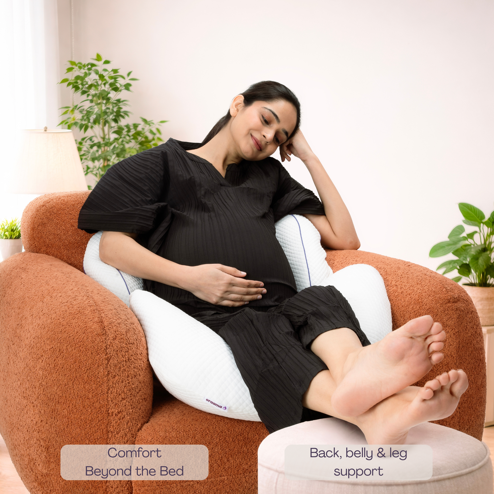 Oraama is designed to remain useful beyond pregnancy, offering gentle support during moments of rest and closeness after birth. Its adaptable form allows it to be repositioned to provide comfort while feeding, holding, or resting with your baby.